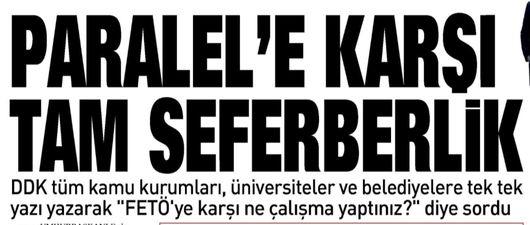 Cumhurbaşkanı Tayyip Erdoğan’ın talimatıyla kamunun tüm kademelerine yerleşmiş Paralel Devlet Yapılanması (PDY) mensuplarına yönelik araştırma başlatan Devlet Denetleme Kurulu (DDK), bu konudaki çalışmasını derinleştirdi. DDK, bakanlıklar, kamu kurumları ve üniversitelere tek tek yazı yazarak PDY ile mücadele konusunda yaptıkları çalışmaları sordu. DDK, nüfusu 30 binin üzerindeki tüm belediyelere de yazı yazarak, 2005’ten bu yana PDY ile bağlantılı kişi ve kurumlara yapılan tahsisler hakkında bilgi istedi. 14 vakıf üniversitesinde de genel inceleme başlatan DDK, bu üniversitelerde PDY’nin yerleşme durumunu da ayrıca ele alacak. DDK, Milli Güvenlik Siyaset Belgesi’nde yer alan tehditlerden biri olan PDY ile ilgili çalışma için özel bir ekip kurdu. DDK Başkanı Yunus Arıncı’nın başında bulunduğu 9 kişilik ekip, devletin tüm kurumlarını mercek altına aldı.