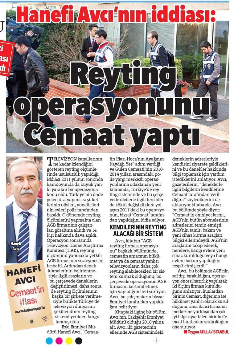 Eski Emniyet Müdürü Hanefi Avcı, “Cemaatin İflası-Hoca’nın Ayağının Kaydığı Yer” adını verdiği ve Gülen Cemaati’nin 2010-2014 yılları arasındaki polis-yargı merkezli operasyonlarına odaklanan yeni kitabında, Türkiye’de reyting sisteminde ve bu çerçevede dizilerle ilgili tercihlerde köklü değişikliklere yol açan 2011’deki bu operasyonun, bizzat ‘Cemaat’ tarafından yapıldığını iddia ediyor.