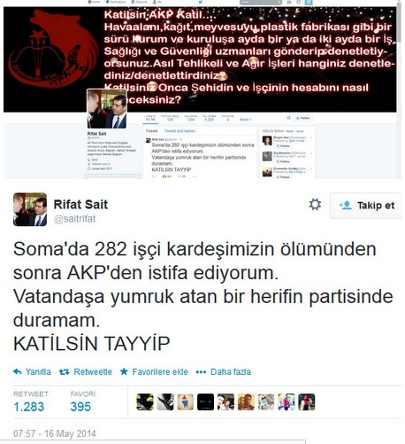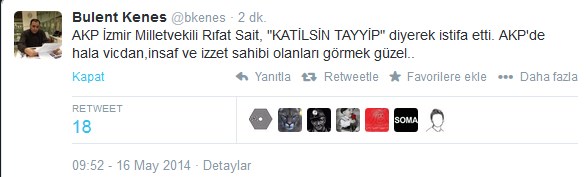 Twitter hesabı hacklenen AK Parti İzmir milletvekili Rıfat Sait adına atılan “Soma’da 282 işçi kardeşimizin ölümünden sonra AKP’den istifa ediyorum. Vatandaşa yumruk atan bir herifin partisinde duramam. KATİLSİN TAYYİP” twitlerini gerçek sanan Keneş, ısrarla kendisine o hesabın hacklendiği söylenmesine rağmen bir haşhaşi takıntısıyla gerçekmiş gibi yorumlar yaptı.