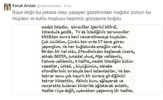 Gülen örgütünün ruh hastası ve şizofren tetikçilerinden Faruk Arslan o mesajı Twitter’da şöyle paylaştı: