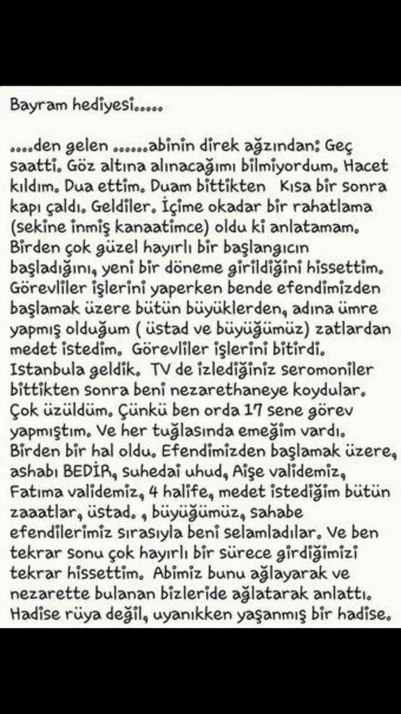 Olum ruh hastası ve şizofren tetikçi Faruk Arslan ve yaşayan-yaşatan MAĞRUR polis eyi dinleyin. İşte bu düşünceyle madem nezarethanede kalp gözünüz açılıyor, açılmış kalın orda, bu lezzeti herkes tadamaz, şahsen ben Peygamber Efendimizi görmek için neler feda etmezdim ki! Bak sizlere ne güzellikler yapılıyor da farkında değilsiniz, dönüp teşekkür edeceğinize hırlıyorsunuz. Bize bu imkanı tanıyanlardan Allah razı olsun deyin bakıyım. MAĞRUR polis hayırlı bir sürece girmiş, eee ne güzel işte! Bu hayırlı sürecin içinde bulunacakları deşifre ederek sayılarını artıralım, hatta tabiri caizse Feto’yu getirerek bereketlendirelim. Değil mi ruh hastası ve şizofren tetikçi Faruk Arslan ve o rüyayı gören MAĞRUR polis, yanlışım var mı gardaşım? Iııı! Doğru söylüyorum değil mi?