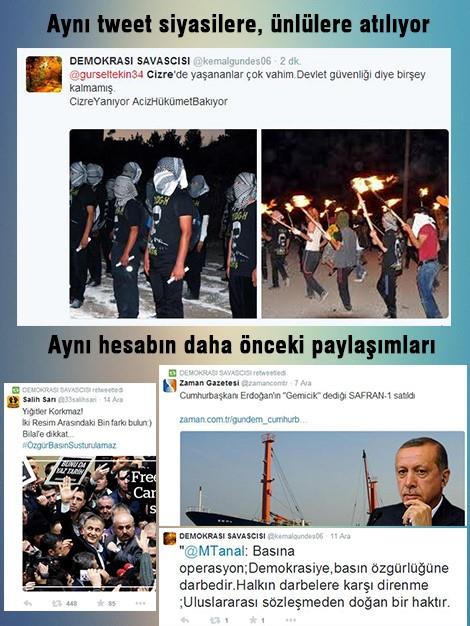 Sahte hesaplardan atılan tweetlerin bir çoğunda yer alan “CizreYanıyor AcizHükümetBakıyor” etiketi Gezi dönemi ve dershane tartışmalarında olduğu gibi Twitter’da bulunan Trend Topic yani en çok konuşulanlar listesine sokularak hükümete yönelik tepki oluşturulmaya çalışılıyor.