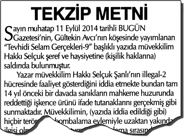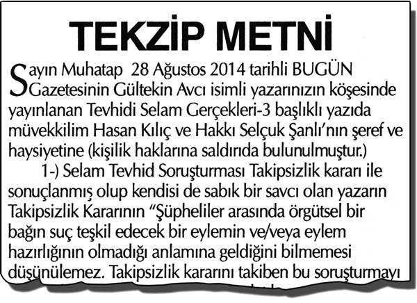 Fetullah Gülen’in bir gülüşüne servetimi bağışlarım” diyen Akın İpek’in sahibi olduğu Bugün gazetesinde yazan Gültekin Avcı’nın “Tevhid-i Selam Gerçekleri” başlığı ile yayınladığı köşe yazılarının yalan olduğu ispatlandı.