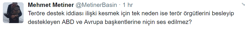 Başını Suudi Arabistan’ın başını çektiği bazı Arap ülkeleri ‘teröre destek oluyor’ iddiasını öne sürerek Katar ile tüm diplomatik ilişkileri kesme kararı aldı. Dünyanın gündemini bir anda değiştiren bu gelişmeyi değerlendiren AK Parti İstanbul Milletvekili Mehmet Metiner, karara sert tepki gösterdi. Sosyal medya hesabı Twitter üzerinden yaptığı açıklamada söz konusu ülkelerin ‘terör’ gerekçesine atıfta bulunan Metiner, terör örgütlerini kuran, besleyen ve büyüten ABD ve AB ülkelerine neden ses çıkartılamadığını söyleyerek “Teröre destek iddiası ilişki kesmek için tek neden ise terör örgütlerini besleyip destekleyen ABD ve Avrupa başkentlerine niçin ses edilmez?” ifadelerini kullandı.