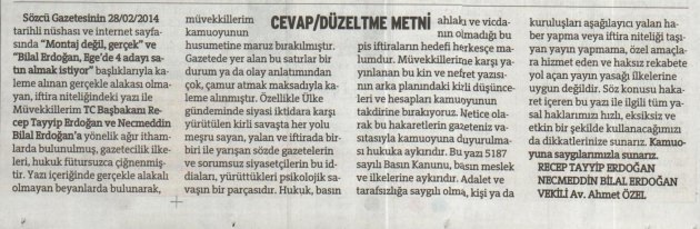 Gazete bugünkü sayısında sürmanşetinde 17 ve 29 Şubat 2014 tarihlerinde yayımladığı iki haber içim ‘Cevap ve düzeltme metni’ başlığında iki tekzip birden yayınlamak zorunda kaldı.