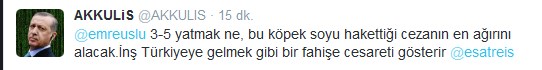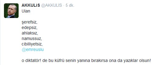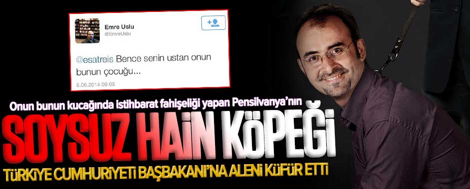 MEDYAGUNDEM.COM- Soysuz, hain, Türkiye’ye ihanet eden şebekenin en aşağılık, en kahpe köpeği Emre Uslu, Türkiye Cumhuriyeti Başbakanı Recep Tayyip Erdoğan’a Twitter üzerinden aleni küfür etti.
