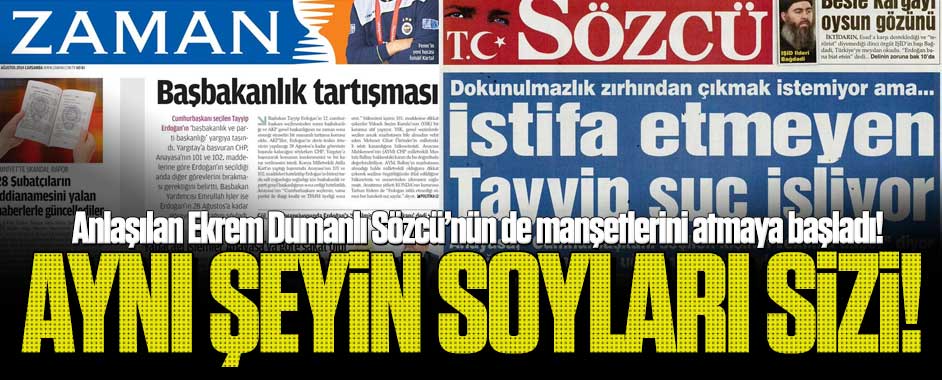 MEDYAGUNDEM.COM- Bugünlerde Gülen örgütü Türkiye’nin millet tarafından ilk kez seçilmiş Cumhurbaşkanı olan Recep Tayyip Erdoğan’ın Başbakanlık görevinden istifa etmemesine taktı. Bugün Zaman gazetesi ve Sözcü paralel işbirliği halinde Erdoğan’ın suç işlediğini bile iddia edecek kadar çıldırdı.