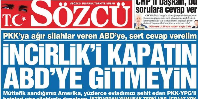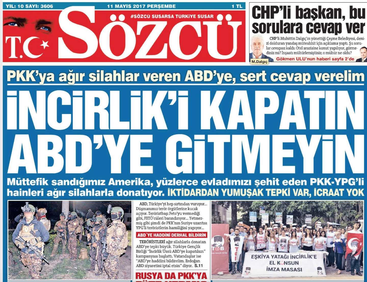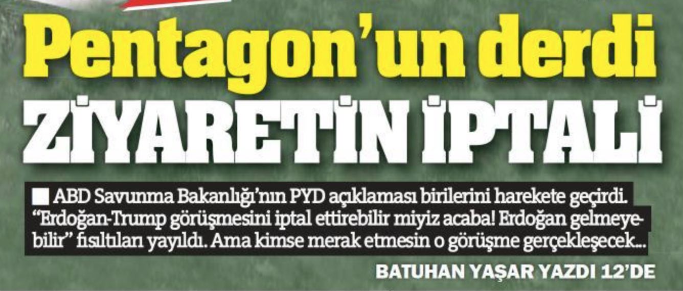 Suriye’de PYD/PKK’yı silahlandıran Pentagon’un derdi 16 Mayıs’ta ABD Devlet Başkanı Donald Trump ile Cumhurbaşkanı Recep Tayyip Erdoğan’ın görüşmesini engellemek. ABD’deki çeteyle eş zamanlı biçimde CHP ce FETÖ Sözcü’sü gazete de “Erdoğan ABD’ye gitmesin” kampanyası başlattı. Bugün Sözcü’nün attığı manşet bir Pentagon planı. Pentagon’un derdini de Türkiye gazetesinde Batuhan Yaşar yazdı. İşte yazısı…