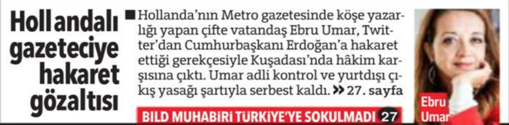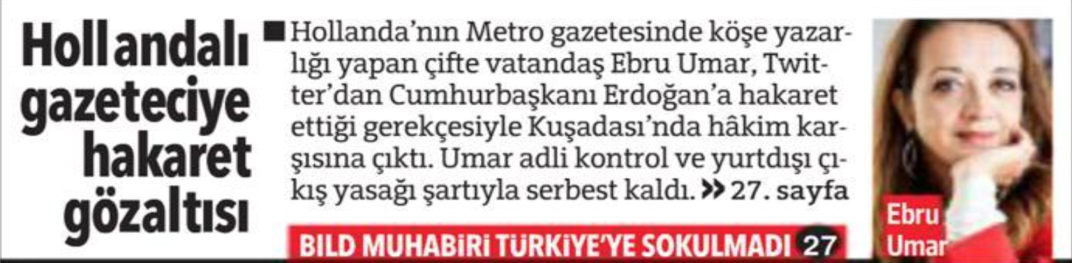 Geldiği Kuşadası’nda gözaltına alınan ve ardından serbest bırakılan Türk kökenli Hollandalı gazeteci Ebru Umar isimli kendini bilmez Hz.Peygamber’e hakaret etti. Başta Hürriyet gazetesi olmak üzere FETÖ medyası Hollandalı alçağın Peygamberimize çirkin küfürlerini görmedi, meseleyi sadece Erdoğan’a hakaret gibi gösterdi.