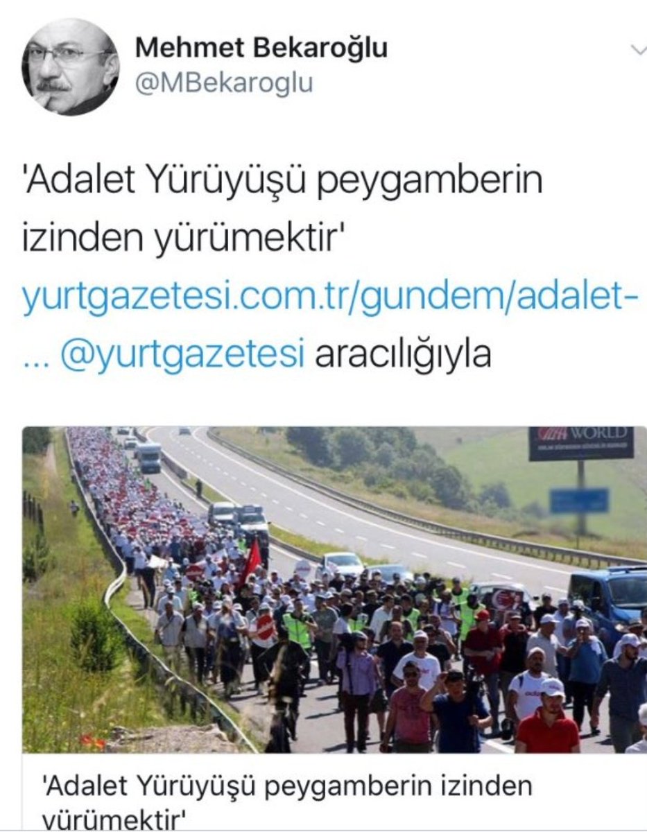 CHP milletvekili Mehmet Bekaroğlu neredeyse tüm terör örgütlerinin ve sapkın grupların destek verdiği bu yürüyüş için ‘Peygamber’in izinden yürümektir’ dedi.
