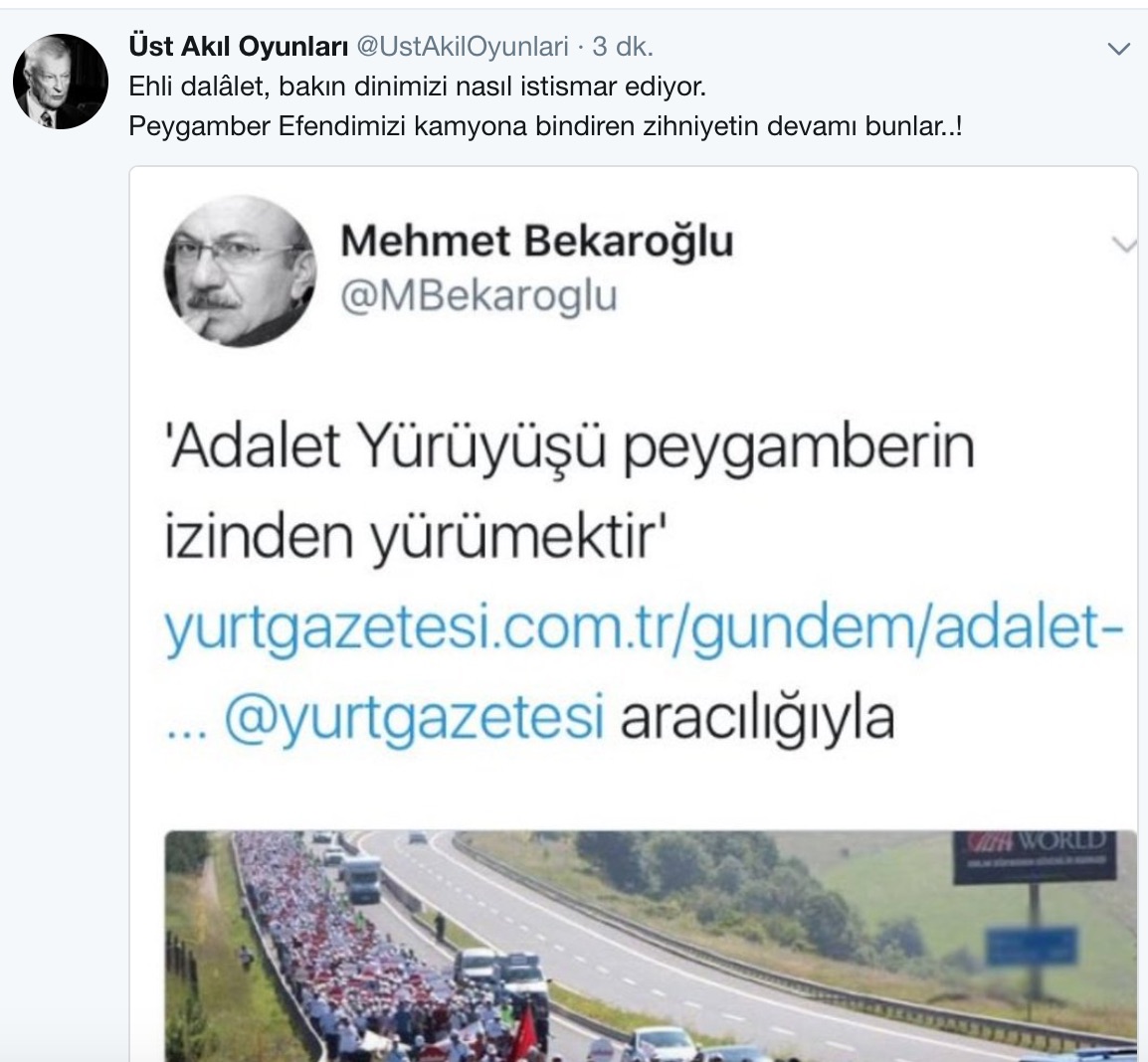 Nasıl bir dönem Samanyolu TV’deki bir dizide Peygamber Efendimiz Hz. Muhammed’i kamyonet sırtına bindirip istismar ettiyse Fetullahçı terör örgütü, FETÖ zihniyeti CHP’de varlık buldu. CHP milletvekili Mehmet Bekaroğlu Kılıçdaroğlu’nun yürüşü için “Peygamber’in izinden yürümektir.” dedi.