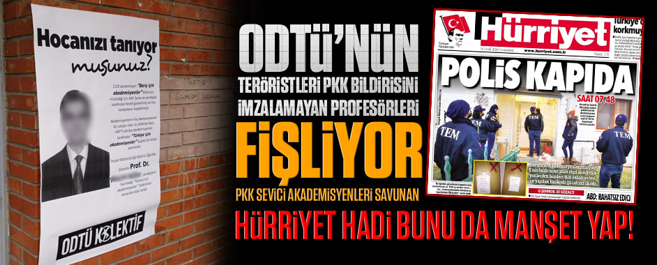 Hürriyet gazetesi PKK sevici akademisyenler için geçtiğimiz gün “kapılarına çarpı atılıyor” diyerek savunan bir manşet yayınlamıştı. Şimdi ODTÜ’deki PKK’lılar tarafından fişlenen profesörler için de manşet yapacak mı merak ediliyor.
