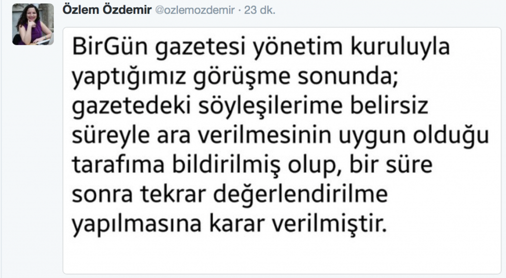 Sürekli basın özgürlüğü eleştirileri yapan Birgün o röportajı yapan elemanını bugün itibariyle kovarak, ikiyüzlülüğünü de gösterdi. Röportajı yapan Özlem Özdemir, gelişmeyi Twitter hesabından duyurdu: