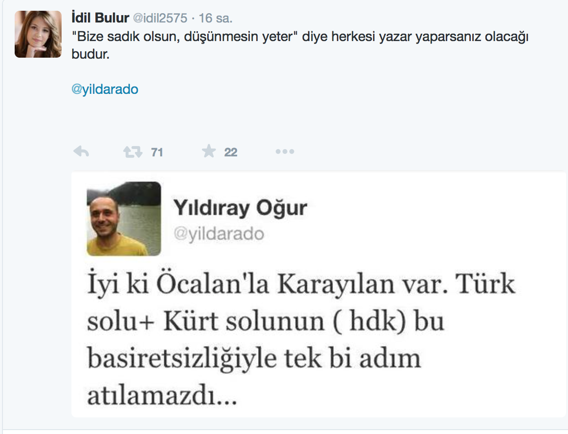 Türkiye gazetesi yazarı Yıldıray Oğur Twitter’da kadın kılığına girip, Atatürkçü gibi ya da başka bir kimliktenmiş gibi davranan Fetocuları fena avladı.