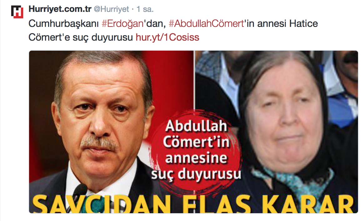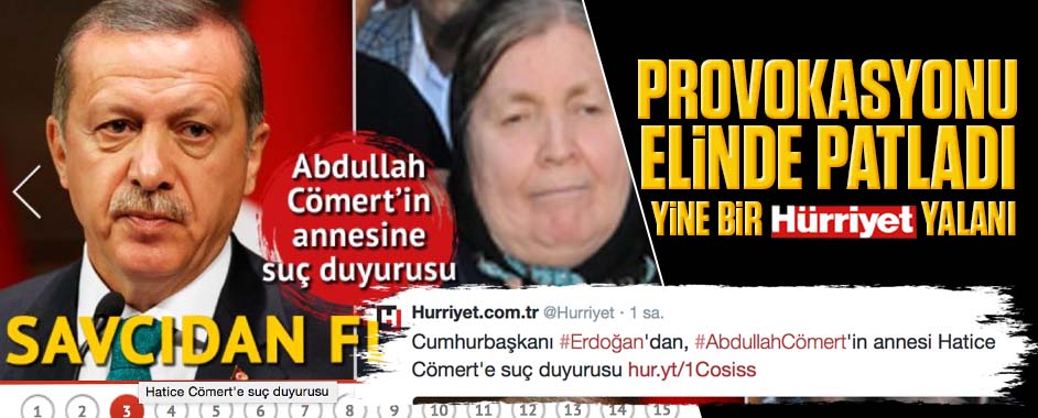 Cumhurbaşkanı Recep Tayyip Erdoğan’ın, Gezi Parkı odaklı bir eylemde hayatını kaybeden Abdullah Cömert’in annesi Hatice Cömert’e dava açtığı yönündeki haberlerin doğru olmadığı belirtildi. Haber Hürriyet gazetesi tarafından gündeme getirilmişti. Gezi kalkışmasının “lokomotifi” Hürriyet bu tür kışkırtma ve provokasyon haberlerini özellikle gündeme getiriyor. Bu kez yalanı ellerinde patladı!