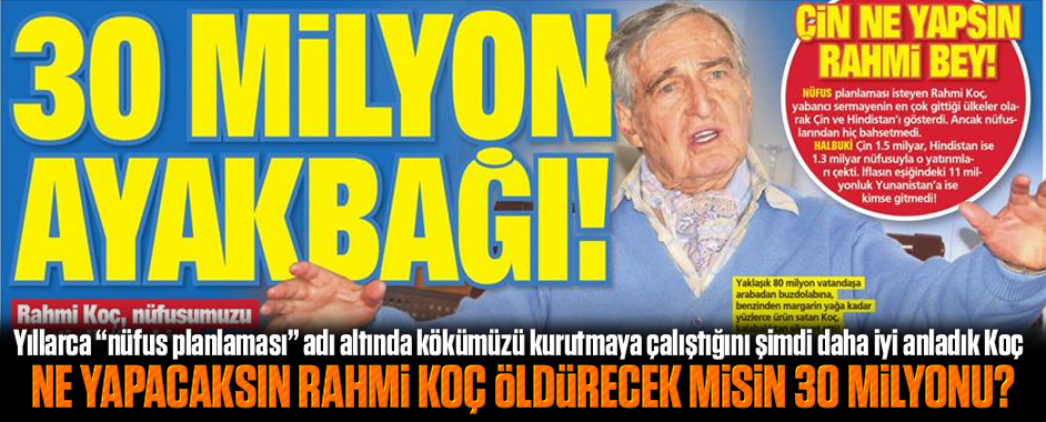Rahmi Koç “Nüfus 80 milyon kişiye doğru gidiyor. Bu bize büyük bir ayakbağı oluyor. 50-60 milyonda kalsaydık. Türkiye’yi ABD ile kıyaslamayın. Türkiye’de birikim yok…” dedi. Bu şok sözlere “Bu neyin kafası” denilerek büyük tepki geldi.