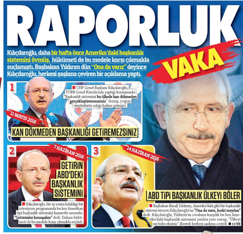 CHP lideri bir hafta önce Amerikan tipi başkanlık sistemine övgüler dizip, “buyurun ABD tipini getirin” dedi. Başbakan Yıldırım, olumlu yanıt verince Kılıçdaroğlu bu kez ‘biz istemiyoruz’ diye karşı çıktı.