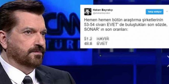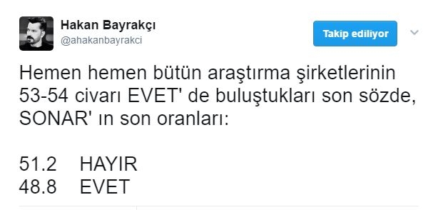 Anket sonuçlarını Twitter hesabından paylaşan SONAR Başkanı Hakan Bayrakçı, yurttaşların yüzde 51.2’sinin‘Hayır,’ yüzde 48.8’inin de ‘Evet’ diyeceğini yazdı.