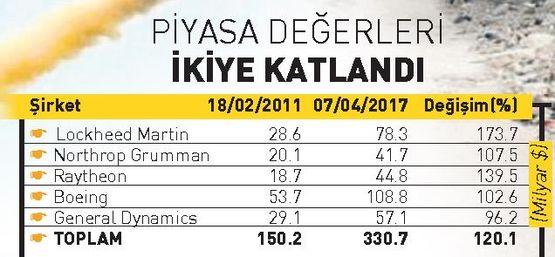 B-52 uzun menzilli bombardıman uçaklarını üreten Nortrop Grumman’ın da 2011 başında 20.1 milyar dolar olan piyasa değeri şu an 42 milyar dolara dayandı.