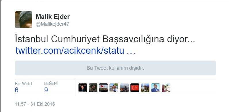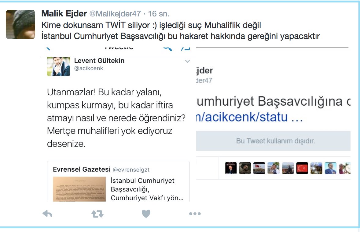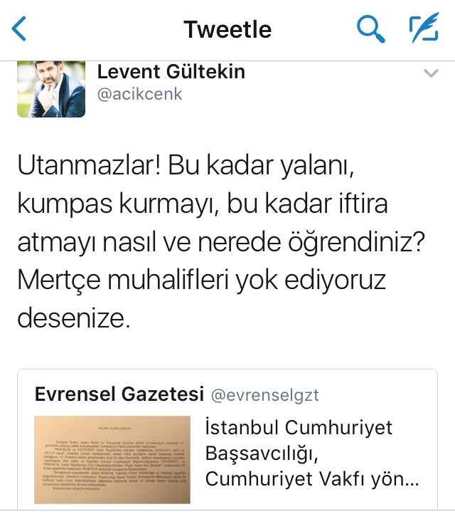 CIA tarafından fonlanan, Cumhuriyet gazetesi gibi FETÖ ve PKK gibi terör örgütlerine tetikçilik yapan, Amerikan çıkarlarını savunmak için kurdurulmuş, Türkiye düşmanı Diken isimli sitenin yazarı Levent Gültekin, FETÖ operasyonlarını yürüten yargı mensuplarına hakaret etti. Twitter’daki hakareti belgelendi. Çünkü kendisi o tweetini sildi. Cumhurbaşkanı Erdoğan’a her fırsatta saldıran Gültekin için savcıları göreve çağırıyoruz.