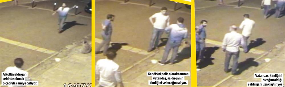 Bir başka vatandaş ise zarar vermesini engellemek için, saldırgana kendisini polis olarak tanıtarak kimliğini vermesini istedi. Kimliğini aldıktan sonra cebindeki ekmek bıçağını da teslim etmesini isteyen vatandaş, bıçağı da aldıktan sonra alkollü saldırganı alarak bölgeden uzaklaştırdı. İmam Mustafa Temiz saldırganı tanımadıklarını, kendisini polis olarak tanıtan kişinin ise cami cemaatinden olduğunu anlattı. Temiz, saldırganla ilgili suç duyurusunda bulunmadıklarını söyledi.