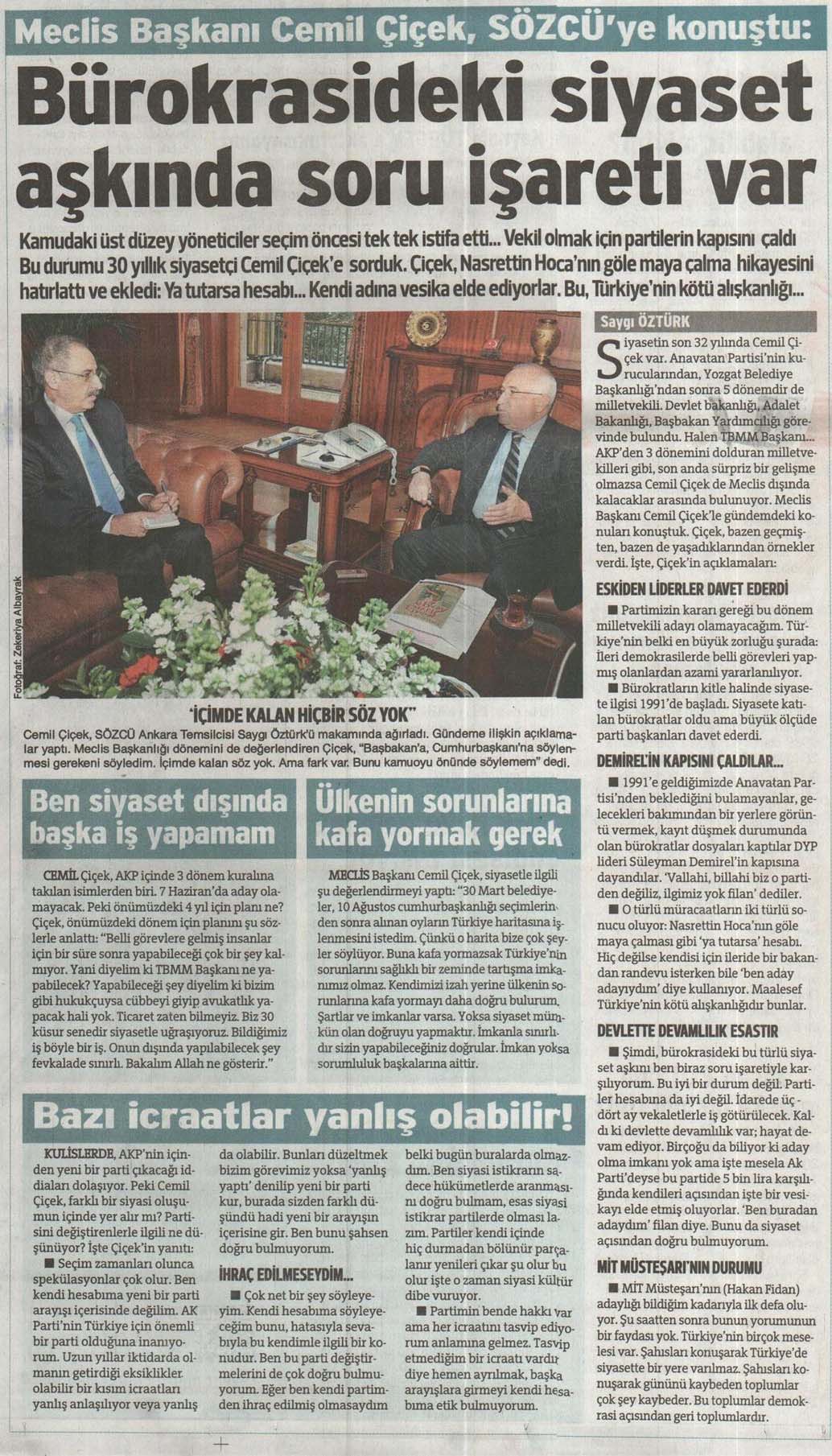 TBMM Başkanı paralel örgütün operasyon gazetelerinden Sözcü’ye konuştu. Çiçek’in paralel örgütle derin bağı deşifre olan Saygı Öztürk’e konuşması düşündürücü. Daha da ilginci paralel çete Cemil Çiçek için dün neler neler demişti. “Ergenekoncu, derin devletin adamı” diye suçlanan Çiçek şimdi Gülen örgütünün “medet” umduğu bir isim haline geldi.