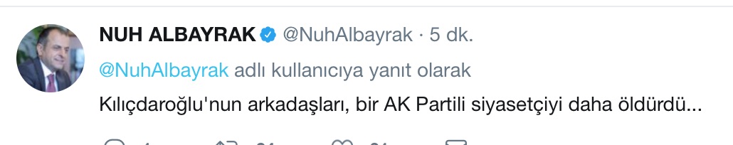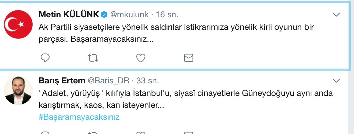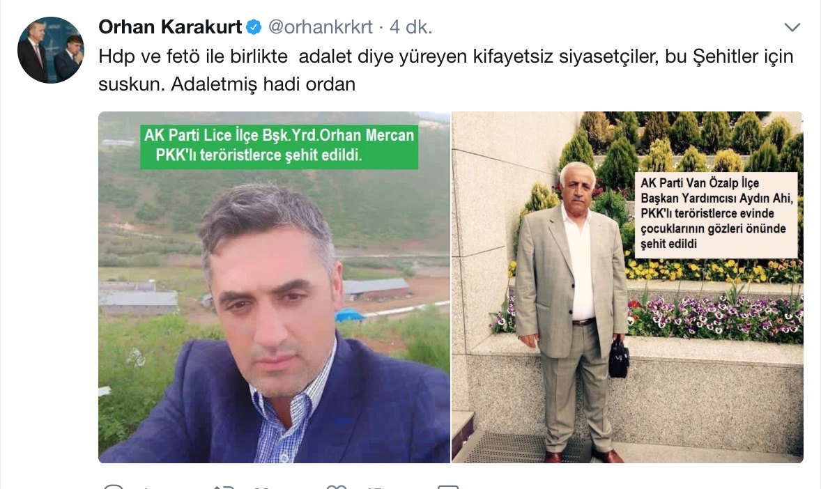 Dün AK Parti Diyarbakır’ın Lice İlçe Başkan Yardımcısı Orhan Mercan evinin önünde uğradığı silahlı saldırı sonucu hayatını kaybetti. Bugün de PKK terör örgütü Ak Parti Van ili Özalp İlçe Başkan Yardımcısı Aydın Ahi’yi evinin önünde katletti. CHP Genel Başkanı Kemal Kılıçdaroğlu da sözde “adalet yürüyüşü” adı altında PKK terör örgütünün desteğiyle yürüyor.