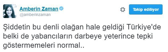 PKK’nın gazetecisi Amberin Zaman Gaziantep patlaması ile ilgili Twitter’dan “Şiddetin bu denli olağan hale geldiği Türkiye’de belki de yabancıların darbeye yeterince tepki göstermemeleri normal..” yazınca tepkilere neden oldu.