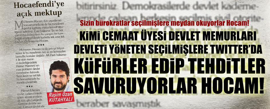 “Hocaefendi’ye açık mektup” yazısında Kütahyalı Gülen’e “Sizin bürokratlar seçilmişlere meydan okuyor” mesajı verdi. Kütahyalı bazı cemaat mensubu devlet memurlarının da Twitter’da seçilmişlere ağza alınmayacak küfürler ettiğini ve tehditler savurduğunu yazdı.
