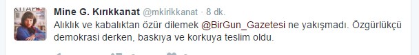 Birgün’ün özür dilemesine ilk tepki Mine Kırıkkanat’tan geldi. Kırıkkanat “Özgürlükçü demokrasi derken, baskıya ve korkuya teslim oldu” diyerek gazeteyi eleştirdi.