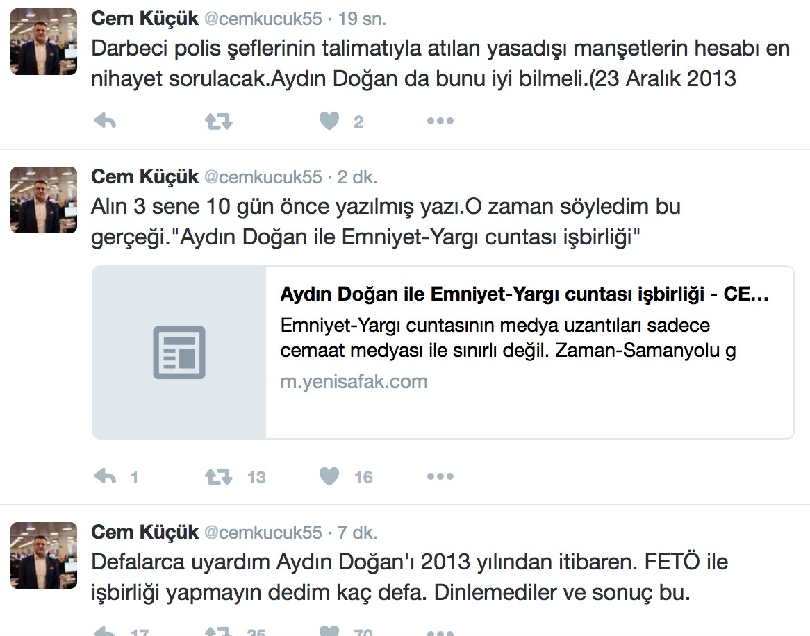 Doğan Holding’e yönelik FETÖ operasyonuna gazeteci Cem Küçük’ten Twitter’da çarpıcı yorumlar geldi.