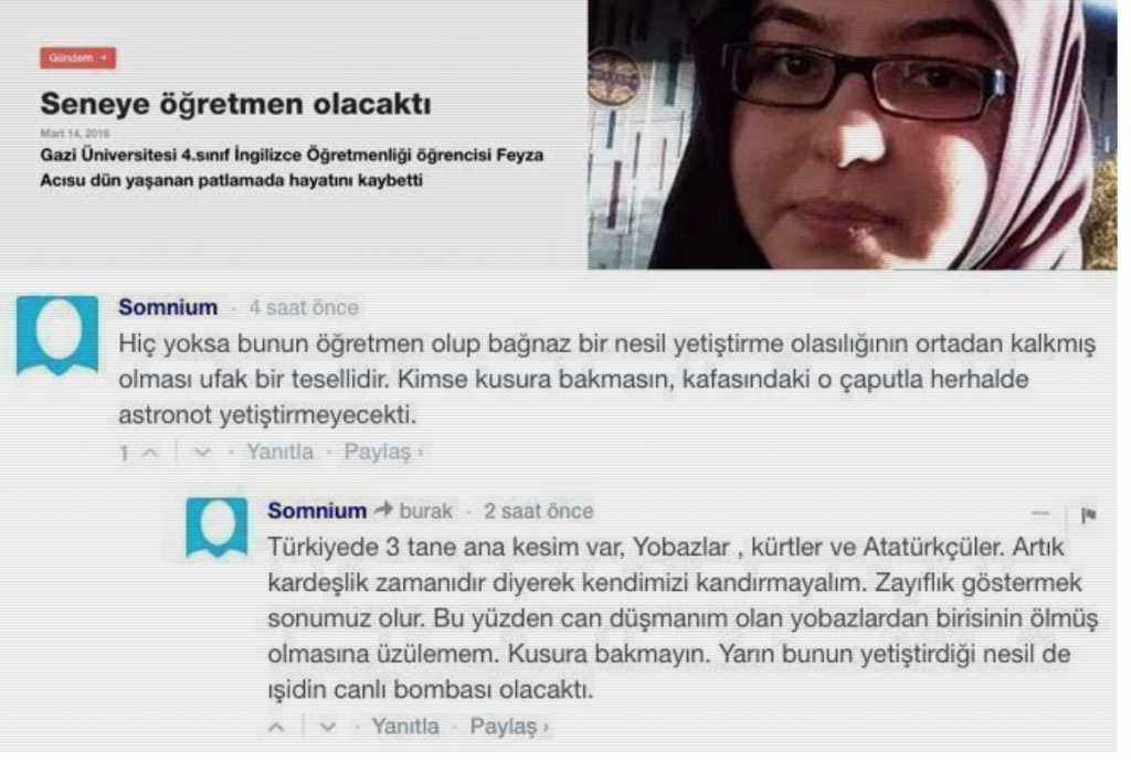 Ankara’da gerçekleştirilen terörist saldırıda yaşamını yitiren Gazi Üniversitesi İngilizce Öğretmenliği son sınıf öğrencisi Feyza Acısu için Sözcü’de yer alan haberde bulunan bir yorum kan dondurdu. Acısu’nun başörtülü olduğunu gören kullanıcı, ‘Tesellimiz ölenlerden biri başörtülü’ yorumunu paylaştı.