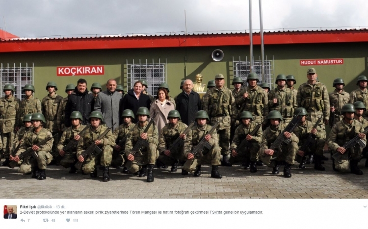 Milli Savunma Bakanı Fikri Işık’ın, Edirne ziyareti sırasında 54’üncü Mekanize Piyade Tugay Piyade Tugay Komutanlığı önünde, karşılama mangasının diz çökerek verdiği hatıra fotoğrafı CHP ve Sözcü gibi medya organları tarafından siyaset malzemesi yapılmıştı.