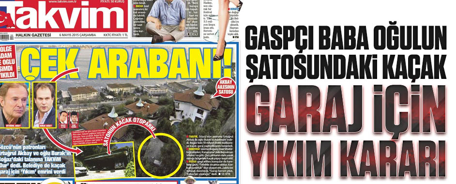 Takvim, kurulduğu günden bu yana habercilik yapmak yerine insanlara iftira atmayı tercih eden Sözcü’nün foyasını bir kez daha ortaya çıkardı. Okurlarına fakir edebiyatı yapan ve kendilerini duyarlı, çevreci, hak savunucusu ve halkçı olarak gösteren Sözcü’nün sahibi Ertuğrul Akbay ile oğlu Burak’ın Kuruçeşme’de, Boğaziçi Köprüsü’ne birkaç yüz metre uzaklıkta, 50 milyon lira değerinde bir malikanede yaşadıkları kanıtlandı. Bağlı bulundukları baronlara ve kendilerine ters düşen herkese imar ve kaçak yapı iftirasını atan baba-oğulun aslında kendilerinin arazi mafyacılığı yaptığı belirlendi.