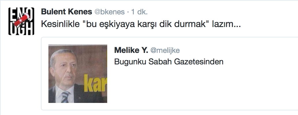 Fetocu terör örgütünün meczup gibi sadece küfür eden tetikçisi, Today’s Zaman yayın yönetmeni Bülent Keneş, Cumhurbaşkanı Erdoğan’a “eşkiya” diyerek hakaret etti. Twitter’dan Sabah gazetesinin bugün manşetine yer alan bir haberi paylaşıp, Erdoğan’a “eşkiya” hakaretinde bulunan FETÖ militanını ya tımarhaneye kapatın, ya da hapishaneye sokun… Bu müptezelin yaptığı ne gazetecilik, ne düşünce özgürlüğü…