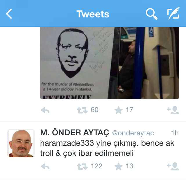 “Haramzadeler” hesabı  17-25 Aralık darbe sürecinde Gülen örgütünün montajlı tape ve kasetlerinin servis edildiği en ünlü sosyal medya hesaplarından biriydi. Aytaç’ın bu twiti tam bir itiraf gibi. “Haramzade333”ün “troll” olduğunu bilen, demek ki o tapeci, şantajcı, montajcı, pornocu paralel hesapları da kontrol eden kişi olmalı… Hangi paralel operasyon hesabına itibar edileceğine karar veren, bunu da takipçilerine duyuran kişi, o hesapları yürüten el de olmalı.