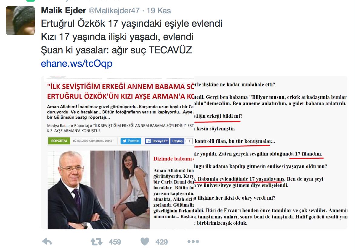Tamamen çocuk yaştaki evliliklerin getirdiği ve aileleri kapsayan yasa teklifini, “tecavüze af” gibi göstererek siyasi istismar ve provokasyon konusu yaparak, sokakları karıştırmaya çalışıyorlar. Yine kaos ittifakı aynı odaklar… CHP, HDP, PKK, FETÖ, sol terör örgütleri, Doğan medyası… Hele hele Doğan medyası… Gezi kalkışmasından bildiğimiz numaralarla konuyu çarpıtıp kaşıyor, kaos ve sokak terörörü için zemin hazırlıyor. Peki siz biliyor musunuz? Şimdi o yasa teklifi için “tecavüz meşrulaştırılamaz” diyen Hürriyet yazarı Ertuğrul Özkök’ün karısıyla 15 yaşındayken sevgili olduğunu, 17 yaşında evlendiğini… Yani bu durumda Ertuğrul Özkök de tecavüzcü…. Bakın belgeleri…