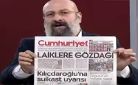 Okmeydanı’nda bir grupla kahvehaneleri dolaşarak “laiklik elden gidiyor” diyerek provokasyonlarda bulunan Ayşegül Başar’ın gözaltına alınmasını bugünkü manşetinde “Laiklere gözdağı” başlığıyla veren Cumhuriyet gazetesine gazeteci Hikmet Genç 24 TV’de yayınlanan Günün Manşeti programında tepki gösterdi.