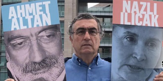 Kandil’de PKK yöneticileriyle görüşen, hendek başında teröristlerle poz veren Hasan Cemal bu kez de Nazlı Ilıcak ve Altan kardeşlerin arkasında… Cemal, adliye önünde Nazlı Ilıcak ve Ahmet Ahmet Altan’ın posterini taşıyıp sanıklara destek verdi.