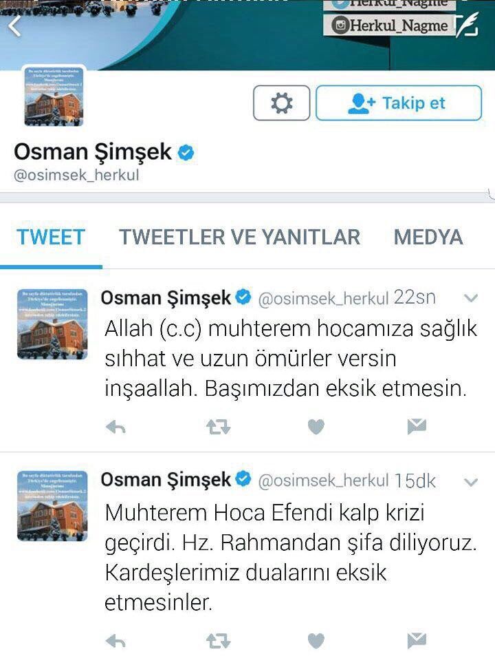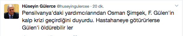 Gazeteci Hüseyin Gülerce, teröristbaşı Fetullah Gülen’in kalp krizi geçirdiğini iddia etti. Gülerce’nin kaynağı, teröristbaşı Gülen’in Pensilvanya’daki sağ kollarından Osman Şimşek’in tweetleri.