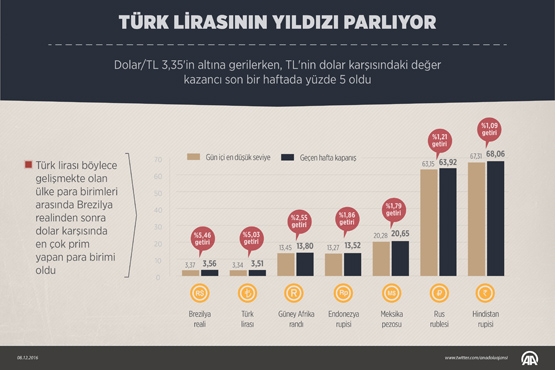 Aynı dönemde gelişmekte olan ülke para birimlerinin dolar karşısındaki hareketleri incelendiğinde; Brezilya realinin yüzde 5,5, Güney Afrika randının yüzde 2,6, Endonezya rupisinin yüzde 1,9, Meksika pesosunun yüzde 1,8 ve Rus rublesinin yüzde 1,2 değer kazandığı görülüyor.