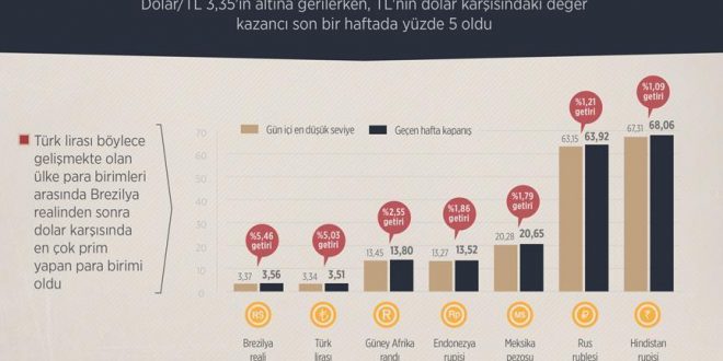 Dolar/TL 3,35’in altına gerilerken, TL’nin dolar karşısındaki değer kazancı son bir haftada yüzde 5 oldu. Türk lirası böylece gelişmekte olan ülke parabirimleri arasında Brezilya realinden sonra dolar karşısında en çok prim yapan para birimi oldu.