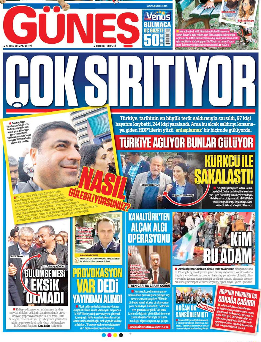 Dün gerçekleşen hain saldırı sonrası aynı yerde anma törenine katılan HDP’lilerin sırıtan suratları bugün Güneş gazetesine çarpıcı biçimde manşet oldu. İşte Güneş’in birinci sayfası: