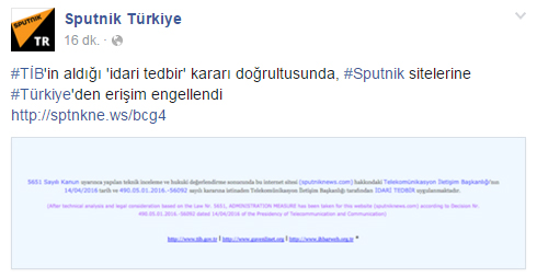 Engelleme kararı, Sputniknews Türkiye ekibi tarafından sosyal medya hesaplarından duyuruldu.