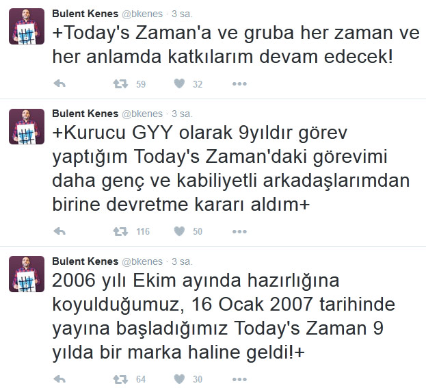 “2006 yılı Ekim ayında hazırlığına koyulduğumuz, 16 Ocak 2007 tarihinde yayına başladığımız Today’s Zaman 9 yılda bir marka haline geldi! Kurucu GYY olarak 9 yıldır görev yaptığım Today’s Zaman’daki görevimi daha genç ve kabiliyetli arkadaşlarımdan birine devretme kararı aldım. Today’s Zaman’a ve gruba her zaman ve her anlamda katkılarım devam edecek!”