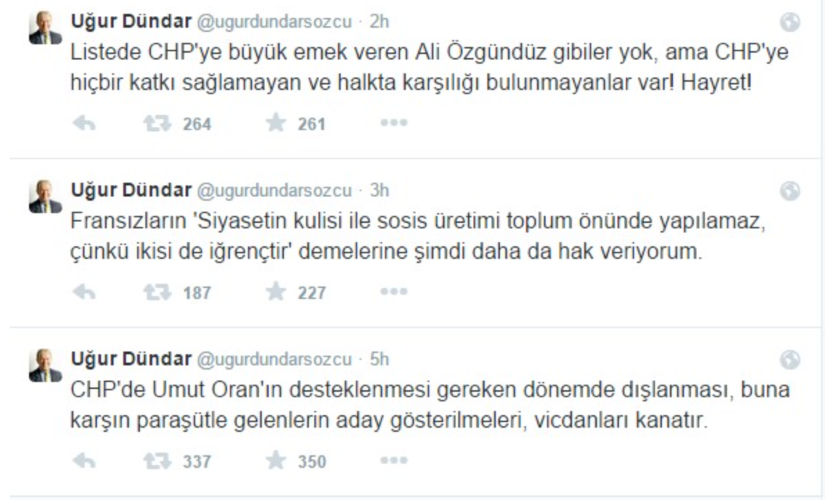Gazeteci Uğur Dündar, CHP’nin milletvekili aday seçimine tepki gösterdi. Dündar, Twitter hesabından “CHP’de Umut Oran’ın desteklenmesi gereken dönemde dışlanması, buna karşın paraşütle gelenlerin aday gösterilmeleri, vicdanları kanatır” açıklamasında bulundu.