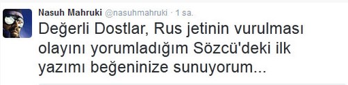 Türkiye ve Rusya arasındaki uçak kriziyle ilgili, “Putin’den ricam bunun bedelini Türk insanına değil AK Parti’ye ödetsin” şeklinde skandal bir paylaşımda bulunan AKUT’un kurucu üyesi ve yönetimin kurulu başkanı Nasuh Mahruki Sözcü gazetesinde yazarlığa başladı.
