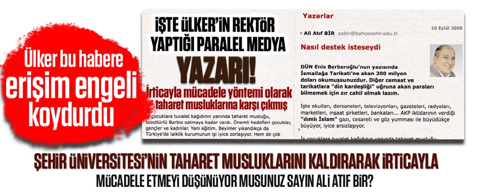 Milat gazetesinde geçtiğimiz gün Prof. Dr. Sefa Saygılı çarpıcı bir yazı yazdı. Yazı Şehir Üniversitesi’ne Murat Ülker’in seçtiği rektör Ali Atıf Bir’in Hürriyet gazetesinde yazdığı “okullardaki tuvalet muslukları irticayla mücadele kapsamında kaldırılsın” yazısını konu edinen Saygılı, bir de çarpıcı bir soru yöneltmişti: “Şimdi merak ettiğim konu şu: Sayın rektörümüz Şehir Üniversitesi’nde göreve başlayınca ilk iş olarak tuvaletlerdeki muslukları mı kaldıracaktır?” Alıntı yaptığımız o yazıya Ülker erişim engeli koydurdu. Yani özgür medyaya Ülkr engel koydurdu. Yani o yazıyı mahkeme kararıyla okuyamayacaksınız. Ancak Sefa Saygılı bugün çarpıcı bir yazı daha yazdı Milat’ta. Yazısında fikri takiple o soruyu tekrar sordu: “Şehir Üniversitesi tuvaletlerinden muslukları iptal ettirerek irtica ile mücadele etmeyi düşünüyor musunuz?” Hadi erişim engeli gelene kadar o yazıyı da okuyun…
