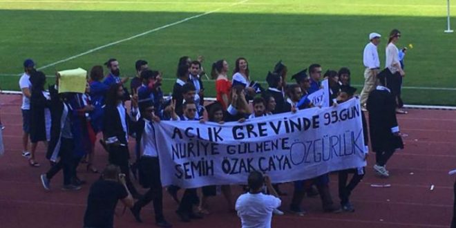 Akdeniz Üniversitesi mezuniyet töreninde “Nuriye Gülmen’e ve Semih Özakça’ya özgürlük” yazılı pankart taşıyan üniversitelilerin evlerine baskın düzenlendi.
