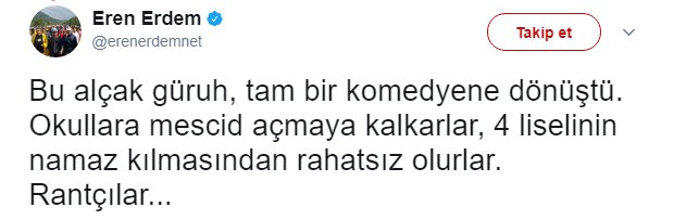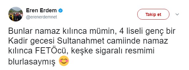 Her ne tuhaf ki, Fetullahçı terör örgütünün çıkarları neyi gerektiriyorsa orada yer alan, FETÖ’nün hesabına bir dönem tetikçilik yapan CHP milletvekili Eren Erdem’in “solcu maskesi” düştü. Sosyal medyada paylaşım rekorları kıran fotoğraflarıyla Eren Erdem’in FETÖ militanı olduğu ortaya çıktı. Erdem yine FETÖ’cü numaralarla inkar etse de fotoğrafları çok şeyi anlatıyordu.